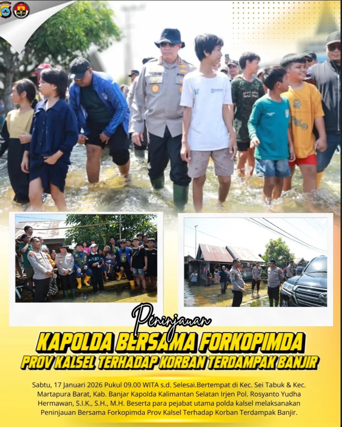 Kapolda Kalimantan Selatan bersama Forum Koordinasi Pimpinan Daerah (Forkopimda) Provinsi Kalimantan Selatan melakukan peninjauan langsung ke lokasi warga yang terdampak banjir. Kegiatan ini bertujuan untuk melihat kondisi masyarakat secara langsung serta memastikan penyaluran bantuan berjalan dengan baik.