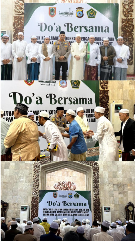 Banjarmasin – Dalam rangka memohon keselamatan bagi korban bencana banjir serta menjaga stabilitas keamanan dan ketertiban masyarakat (kamtibmas) menjelang pergantian tahun, kegiatan doa bersama digelar di Masjid Raya Sabilal Muhtadin, Banjarmasin, Selasa (31/12/2025) sekitar pukul 18.00 WITA.